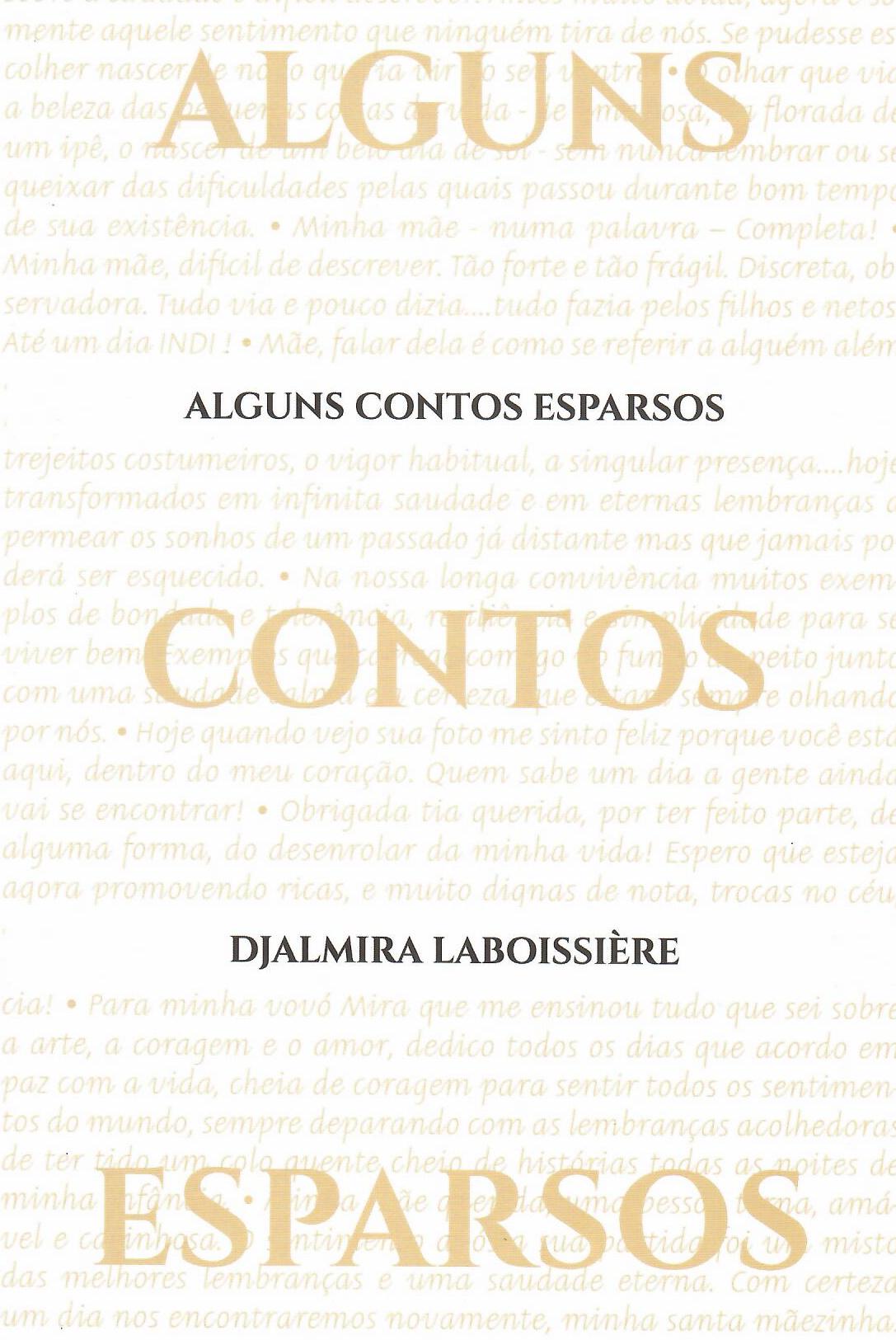 Caros leitores e leitoras da coletânea “Alguns contos esparsos”. Sintam-se convidados a ultrapassar um portal de acesso a um universo literário que transcende as barreiras do convencional e explora a riqueza da experiência humana em suas formas mais cruas e intrincadas. Esta é uma obra que mergulha fundo em temas que desafiam algumas das nossas concepções sobre a vida, a sociedade e a própria natureza das pessoas. Os contos aqui reunidos exploram narrativas, muitas vezes silenciadas, de indivíduos como os imigrantes, que enfrentam desafios e dilemas ao buscar uma vida além de suas fronteiras de origem, em uma pequena amostra das suas lutas, conquistas e perdas. Com uma abordagem franca, o livro evidencia experiências de personagens que enfrentam as sombras do racismo e do machismo, e mostra como essas formas de discriminação moldam vidas e consicionam muitas escolhas. “Alguns contos esparsos” não é apenas uma coletânea a mais; é uma jornada provocativa através dos cantos mais sombrios e luminosos da condição humana. Ao explorar essa multiplicidade de perspectivas, o livro convida e até mesmo desafia quem o lê a confrontar e a questionar seus próprios conceitos - e preconceitos - e a abraçar a complexidade inerente à vida, numa caminhada que tem início num processo de libertação interior, atenta à realidade externa e numa busca incansável de chaves que possam abrir portas para a verdadeira felicidade. Obrigado, Djalmira! - Miriam Pina, do Prefácio