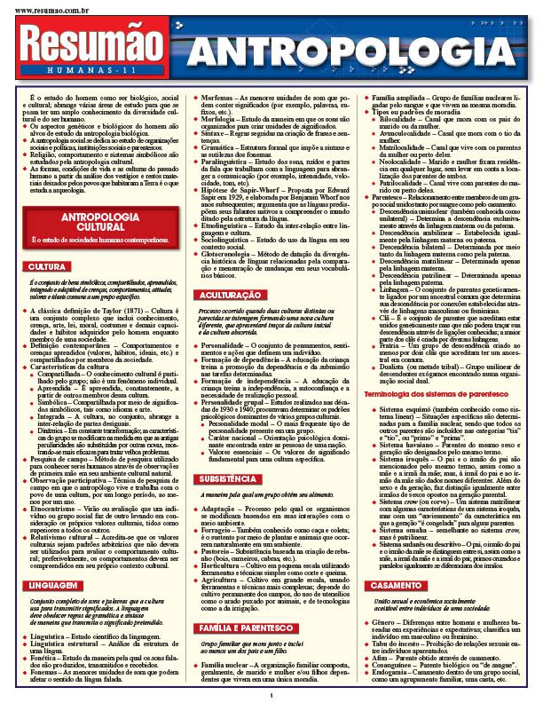 Antropologia cultural:linguagem, aculturação, subsistência, família e parentesco, casamento, grupos não familiares, atividade econômica, arte, organização política, religião e mudança cultural. Antropologia biológica:genética mendeliana, biologia molecular e genética, primatologia, paleoantropologia, evolução humana e as teorias sobre as origens do homem moderno. Arqueologia: tipos de datação, cerâmica, criação de artefatos, períodos de transição, as civilizações e as teorias sobre a evolução delas.