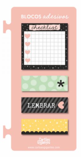 O Kit Blocos Adesivos de Notas é perfeito para complementar seu material de estudos ou de trabalho. Produzido em papel, este kit vem com uma cartela encaixável na espiral de cadernos, planners, agendas e afins, ajudando na organização de suas anotações. O Kit conta com quatro blocos de notas adesivos personalizados, com espaços para checklist e anotações importantes, além de poderem ser usados como lembretes. Muito prático!