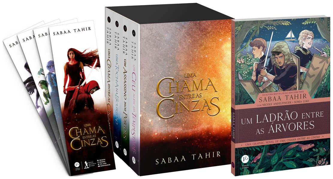 Um box incrível para fãs de histórias épicas e eletrizantes. Em Uma Chama entre as Cinzas , considerada uma das melhores séries de fantasia de todos os tempos, o leitor vai mergulhar em uma história emocionante de liberdade, coragem e esperança que vai deixá-lo ávido por iniciar o próximo livro e fazê-lo desejar que eles nunca chegassem ao fim. O box acompanha quatro marcadores temáticos e a graphic novel Um ladrão entre as árvores , uma prequel da série. “Perfeito para fãs da série Trono de Vidro , de Sarah J. Maas.” — Teen Vogue Uma chama entre as cinzas (434 pág.) Laia é uma escrava. Elias é um soldado. Nenhum dos dois é livre. Laia vive com os avós e o irmão mais velho num mundo brutal, governado pelo ditatorial Império Marcial. Eles não desafiam o Império, pois já viram o que acontece com quem se atreve a isso. Mas, quando o irmão de Laia é preso acusado de traição, ela é forçada a tomar uma atitude. Em troca da ajuda de rebeldes que prometem resgatar seu irmão, ela vai arriscar a própria vida para agir como espiã dentro da academia militar do Império. Ali, Laia conhece Elias, o melhor soldado da academia — e, secretamente, o mais relutante. O que Elias mais quer é se libertar da tirania que vem sendo treinado para aplicar. Logo ele e Laia percebem que a vida de ambos está interligada — e que suas escolhas podem mudar para sempre o destino do próprio Império. Uma tocha na escuridão (434 pág.) Em Uma tocha na escuridão , ambos estão em fuga, lutando pela vida. Os soldados marciais saem à caça de Laia e Elias enquanto eles escapam de Serra e partem numa arriscada jornada pelo coração do Império. Laia está determinada a invadir Kauf, a prisão mais segura e perigosa do Império, para salvar seu irmão. Enquanto Elias está determinado a ficar ao lado dela — mesmo que isso signifique abrir mão da própria liberdade. Mas forças sombrias, tanto humanas quanto sobrenaturais, estão trabalhando contra eles. Elias e Laia terão de lutar a cada passo do caminho se quiserem derrotar seus inimigos, principalmente Helene — a ex-melhor amiga de Elias. Um Assassino nos portões (434 pág.) Dentro e fora do Império Marcial, a ameaça de guerra é cada vez maior em Um Assassino nos portões . Helene procura uma maneira de conter a escuridão que se aproxima ao mesmo tempo em que a vida de sua irmã — assim como a de todos os cidadãos — corre risco. Longe do Império, Laia enfrenta ameaças inesperadas e é atraída para uma batalha que nunca imaginou que precisaria lutar para deter o temido Portador da Noite e acabar com a tirania do Império. Enquanto isso, na terra entre os vivos e os mortos, Elias Veturius abriu mão da liberdade para tentar sobreviver. Mas, ao fazer isso, se entregou a um poder ancestral disposto a qualquer coisa para garantir sua devoção — mesmo que isso signifique abandonar a mulher que ele ama. Um céu além da tempestade (490 pág.) Em Um céu além da tempestade , após ficarem mil anos aprisionados, os djinns partem para o ataque, dizimando vilarejos e cidades. Mas, para o Portador da Noite, a vingança contra os humanos é apenas o começo. Laia de Serra, agora aliada da Águia de Sangue, luta para se recuperar da perda das duas pessoas mais importantes de sua vida. Determinada a impedir o apocalipse que se aproxima, ela desperta um poder ancestral que pode levá-la à vitória — ou a uma tragédia inimaginável. Enquanto isso, para manter seu juramento e proteger o mundo humano do sobrenatural, o Apanhador de Almas deve olhar para além das fronteiras de sua terra. E assumir uma missão que pode salvar — ou destruir — tudo o que ele conhece.