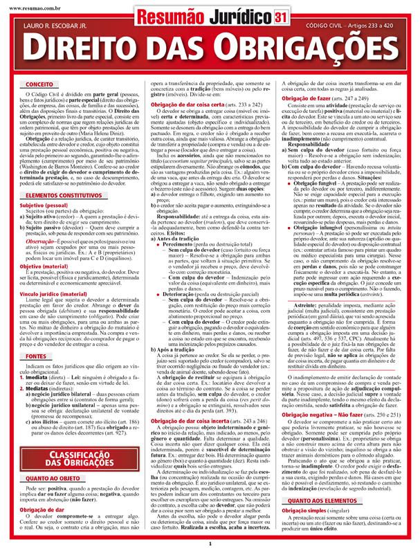 Este título aborda o conteúdo dos artigos 233 a 420 do Código Civil, que trata do Direito das Obrigações. Conceito e elementos constitutivos. Fontes, classificação das obrigações. Cláusula penal. Perdas e danos. Extinção das obrigações: pagamento direto, tempo do pagamento, formas especiais de pagamento, pagamento indireto, pagamento indevido. Extinção da obrigação sem pagamento. Execução forçada. Transmissão das obrigações e declaração unilateral de vontade.