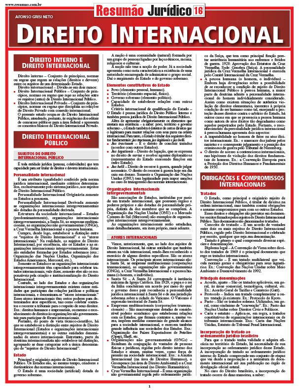 Direito interno e direito internacional. Direito Internacional Público. Estado. Obrigações e compromissos internacionais. Direito Internacional Ambiental. Proteção universal dos direitos humanos. Direitos de integração e direito comunitário. Faixas de comércio internacional. Mercosul. Conflitos internacionais: solução pacífica e solução coercitiva. Direito Penal Internacional. Serviços diplomático e consular. Nacionalidade. Regime jurídico do estrangeiro. Direito internacional da navegação marítima e de navegação aérea. Noções fundamentais de Direito Internacional Privado.
