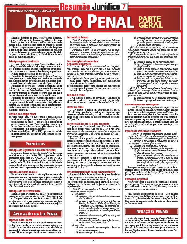 Fontes e princípios gerais do Direito Penal. Divisão do Código Penal. Aplicação da lei penal. Infrações penais – Crime/delito. Resultado. Nexo causal. Tipicidade. Consumação e tentativa. Erro sobre elemento do tipo. Excludente de ilicitude. Culpabilidade. Imputabilidade penal. Potencial conhecimento da ilicitude. Exigibilidade de conduta diversa. Concurso de pessoas. Sanção penal – Espécies de pena: privativas de liberdade, restritivas de direitos, pena de multa. Direitos do preso. Medidas de segurança. Aplicação da pena. Reincidência. Concurso de crimes. Sursis. Livramento condicional. Reabilitação. Extinção da punibilidade.