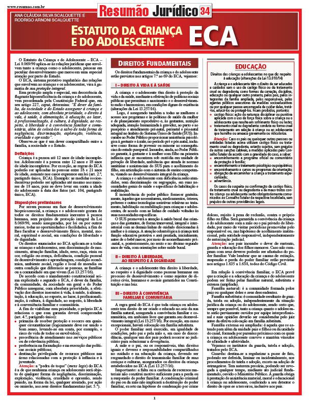 Definições e disposições preliminares do Estatuto da Criança e do Adolescente. Os direitos fundamentais da criança e do adolescente: direito à vida e à saúde, direito à liberdade, ao respeito e à dignidade, direito à convivência familiar e comunitária, direito à educação, à cultura, ao esporte e ao lazer, direito à profissionalização e proteção no trabalho. Sistema de prevenção especial. Política de atendimento. Prática de ato infracional. Remissão. Sistema de proteção integral. Acesso à Justiça. Crimes contra a criança e adolescente. E ainda: as principais regras relativas à adoção (Lei 12.010/09).