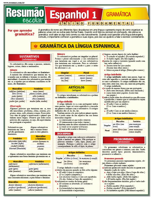 Este Resumão aborda os principais pontos da gramática básica da língua espanhola. O que são substantivos, artigos, pronomes, adjetivos, verbos, advérbios, conjunções e preposições e como usá-los adequadamente na escrita. Dicas rápidas ao longo do texto chamam a atenção do leitor para detalhes importantes da gramática espanhola.