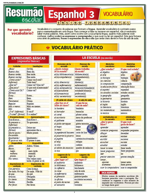 Um guia prático com as expressões básicas da língua espanhola para diferentes situações do cotidiano. O Resumão Espanhol 3 – Vocabulário traz ainda listas de palavras para diferentes momentos: na escola, números e cores, na cidade, em casa, roupas, comida, dizendo as horas, tempo e estações, calendário, descrições, corpo, esportes, tecnologia e outras atividades.