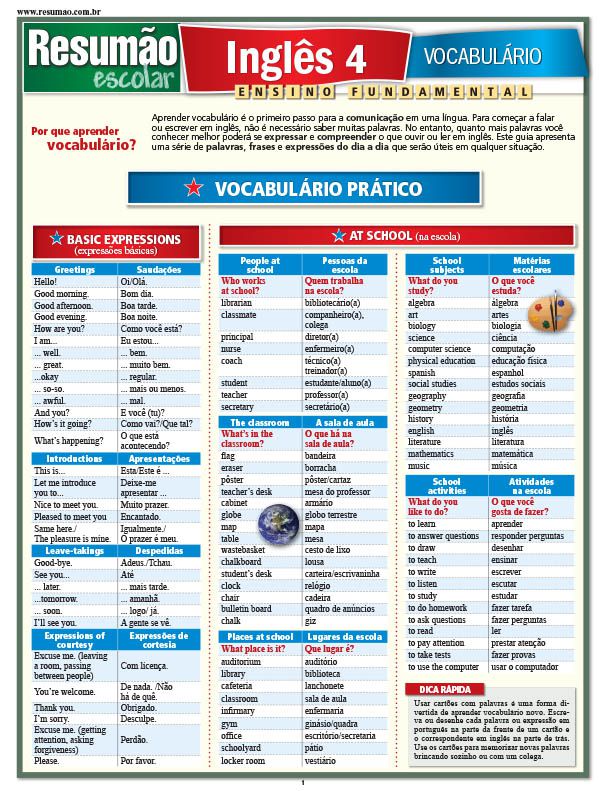 Mais um título da série de inglês da coleção Resumão Escolar, este guia traz vocabulários práticos para diversas situações do cotidiano. Expressões básicas, vocabulário comum na escola, na cidade, o tempo e as estações, os números e as cores, comida, roupas, calendário, esportes, corpo, tecnologia e muito mais.
