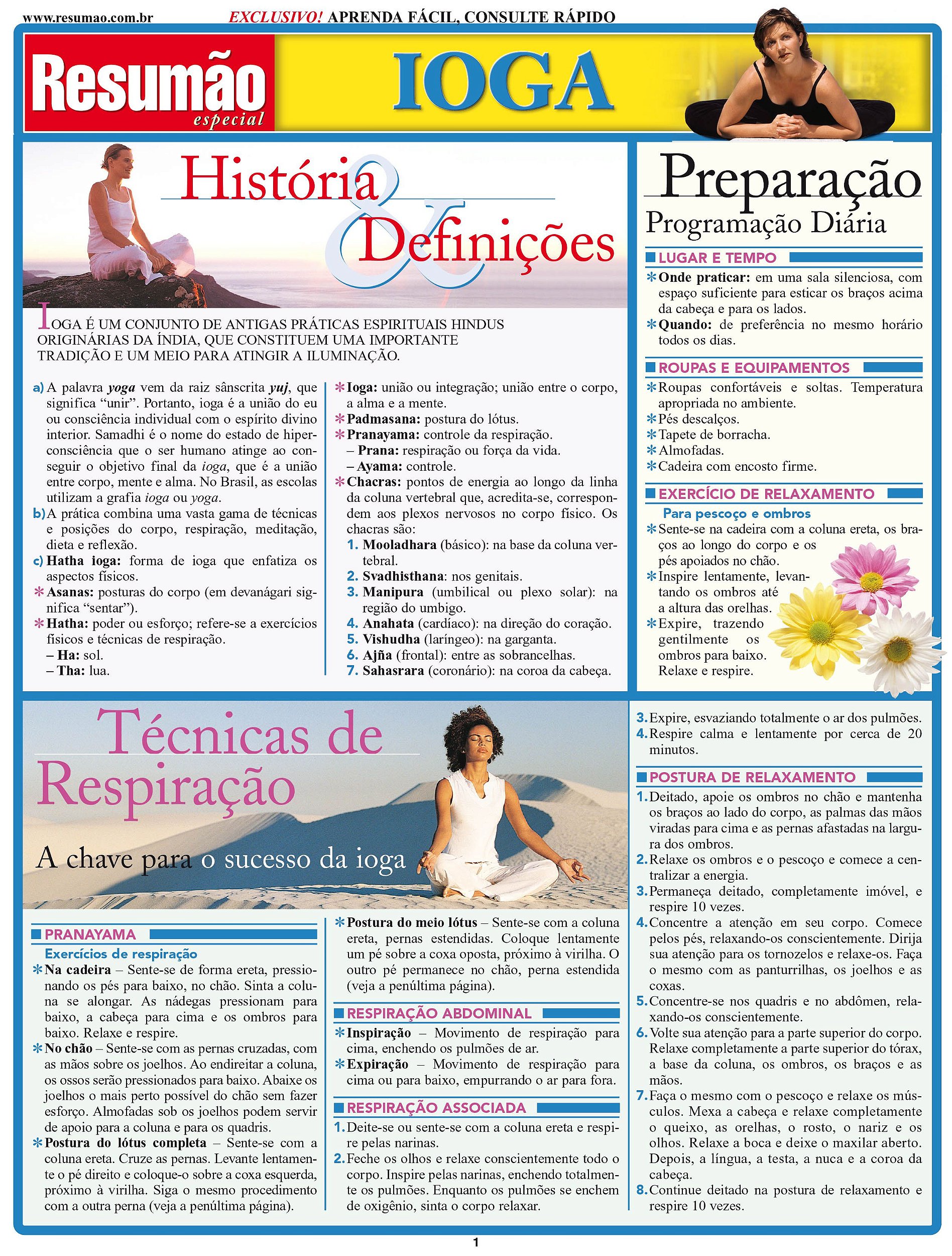 O que é ioga: história e definições. Preparação: programação diária, lugar e tempo, roupas e equipamentos, exercício de relaxamento. Técnicas de respiração: pranayama, respiração abdominal, respiração associada e postura de relaxamento. Posturas de aquecimento: giro do pescoço, da borboleta, do gato e do cachorro. Posturas em pé: da montanha, da árvore, da águia, do guerreiro e inclinada em pé. Posturas no chão: do bebê, de anteflexão, do ângulo aberto, do lótus, do meio lótus, cabeça em direção ao joelho, da cobra, do arco, da ponte. Saudação ao sol.