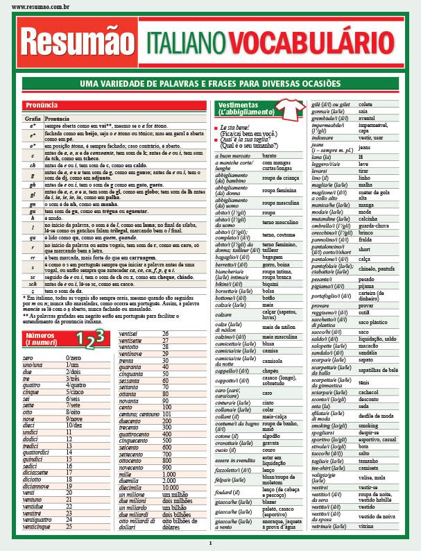Este prático guia de estudos traz uma lista variada de palavras e frases da língua italiana que podem ser usadas em diversas ocasiões. De fácil consulta, aborda os seguintes temas: números, vestimentas, pesos e medidas, compras, cores, cumprimentos, viagem, orientações, meses do ano, data e dias da semana, estações, habitação, as horas, tempo e clima, localização, família e pessoas, computador, e-mail e internet, estudo e trabalho, esportes, espetáculos e diversão, restaurante, corpo, saúde e perguntas.