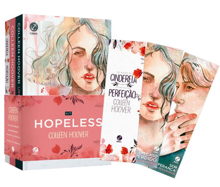 Da autora dos best-sellers É assim que acaba e Verity , conheça Sky, Holder, Six e Daniel em um kit que reúne pela primeira vez as histórias dos personagens da série Hopeless, em novas edições com capas inéditas da artista Carmell Louize e marcadores temáticos. Um caso perdido (384 páginas) Um caso perdido é o primeiro volume da série Hopeless, onde os dilemas e traumas de Sky e Holder são introduzidos de maneira sensível e arrebatadora. Os personagens, com seus complexos passados, viverão uma incrível e inesquecível história de amor. Mas nada será tão fácil... Sem esperança (320 páginas) Após se apaixonar por Sky e Holder em Um caso perdido , agora é a hora de conhecer o outro lado da história... Sem esperança , o segundo volume da série Hopeless, oferece a perspectiva única dos impactantes acontecimentos através do olhar de Holder. Em busca de Cinderela + Em busca da perfeição (256 páginas) Um encontro despretensioso no escuro e uma confissão de amor inesperada: seria a narrativa perfeita, não fosse tudo faz-de-conta. Será que, após o labirinto repleto de imaginação à la Cinderella que Six e Daniel criaram, o verdadeiro amor vai falar mais alto? Embarque – e se apaixone - nessa história de amor nada convencional, cheia de altos e baixos e finais tão felizes quanto reais, com personagens vistos anteriormente nos livros da série Hopeless.