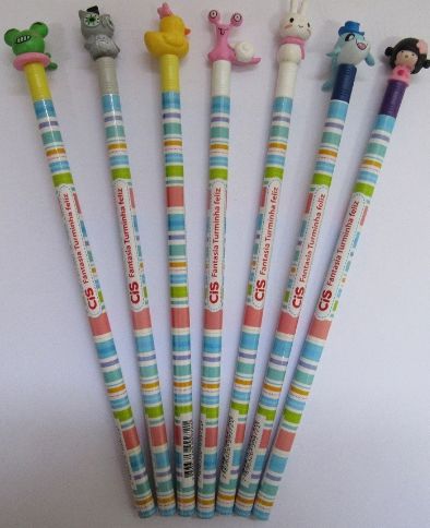 Lápis Fantasia Turminha Feliz Cis Lápis preto com personagens no topo. Disponíveis em 7 modelos diferentes: Sapo, Coruja, Pato, Caracol, Coelho, Baleia e Japonesa. Graduação HB Corpo decorado, revestido de plástico