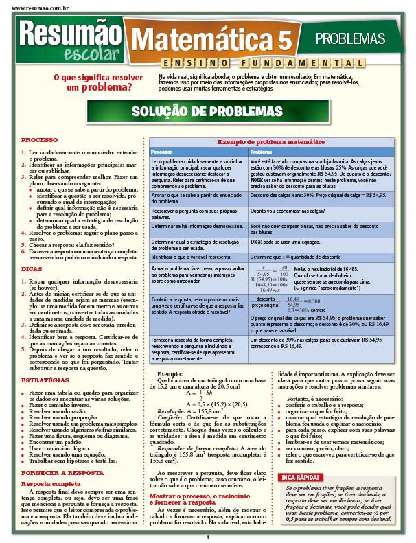 Este prático guia, da coleção Resumão escolar, explica como funciona o processo de resolução de problemas om dicas, estratégias e exemplos. Os pontos abordados são: traduzir os problemas (vocabulário, como usar dicas no contexto), como usar as estratégias (fazer tabelas, fazer o caminho inverso, resolver usando um problema mais simples, resolver usando razão, encontrar um padrão, trabalhar com hipóteses, etc.), tipos de problema e os erros mais comuns (resposta estimada ou precisa, conhecer as fórmulas, etc.).