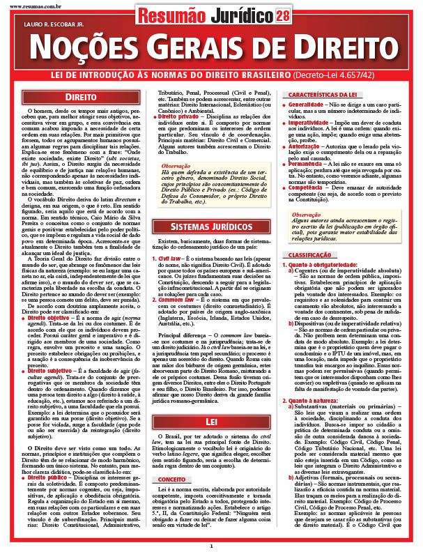 Direito objetivo e Direito subjetivo. Direito público e Direito privado. Sistema jurídicos. Lei: conceito, características, classificação e elaboração das leis. Lei de Introdução ao Código Civil (Decreto-lei 4.657/42). Vigência das leis no tempo, princípio da obrigatoriedade, integração da norma jurídica, interpretação das leis, conflito das normas no tempo e vigência das leis no espaço.
