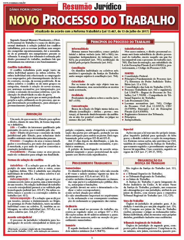 Os conceitos básicos do Direito Processual do Trabalho, já atualizados de acordo com a Reforma Trabalhista. O título traz os conceitos básicos da matéria, escritos de forma clara e objetiva. Os princípios do Processo do Trabalho, jurisdição, procedimento trabalhista, organização da Justiça do Trabalho, competência, atos processuais, prescrição e decadência, reclamação trabalhista, recursos em espécie, execução, procedimentos especiais e muito mais.
