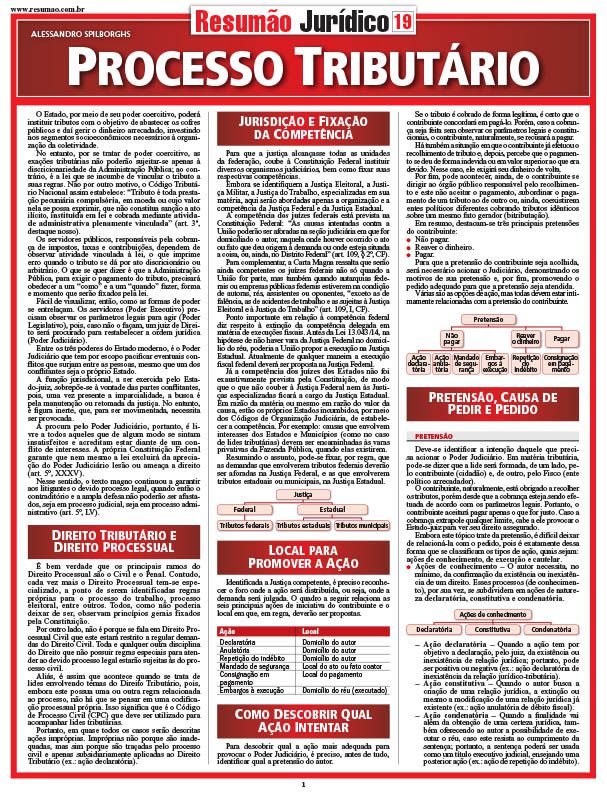 O Direito Tributário e o direito processual. Jurisdição e fixação da competência. Como descobrir qual ação intentar. Pretensão, causa de pedir e pedido. Ação declaratória. Ação anulatória. Mandado de segurança: direito líquido e certo, sujeito passivo e autoridade coatora, foro competente, mandado de segurança individual e coletivo, mandado de segurança preventivo e repressivo, prazo, medida liminar. Ação de consignação em pagamento. Ação de repetição do indébito. Ação de execução fiscal. Embargos à execução fiscal. Ação cautelar fiscal. Processo administrativo federal.