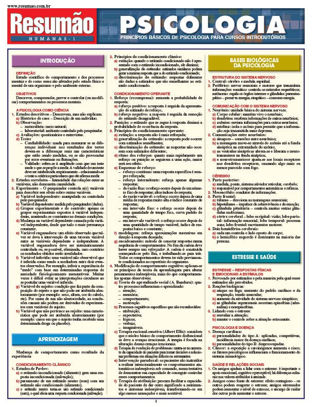 Princípios básicos de psicologia para cursos introdutórios. A psicologia como ciência. Aprendizagem. Bases biológicas da psicologia. Estresse e saúde. Psicologia e doença, saúde e relações sociais. Sensação e percepção. Memória. Linguagem, pensamento e inteligência. Psicologia social. Desenvolvimento. Personalidade. Motivação e emoção. Consciência. Comportamentos patológicos. Tratamentos e terapias: psicoterapia, avaliação de terapias, behaviorismo, psicanálise.