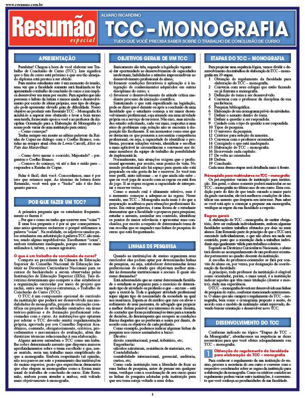 Um guia criado para ajudar o estudante universitário a fazer o trabalho de conclusão de curso. Escrito em linguagem bastante informal, traz um passo a passo detalhado de todas as etapas que o aluno deve cumprir para atingir o resultado esperado: por que fazer um trabalho de conclusão de curso, objetivos gerais do trabalho, as diversas linhas de pesquisa. O desenvolvimento do projeto e as etapas do trabalho. E ainda: quadro com um cronograma prévio de atividades.